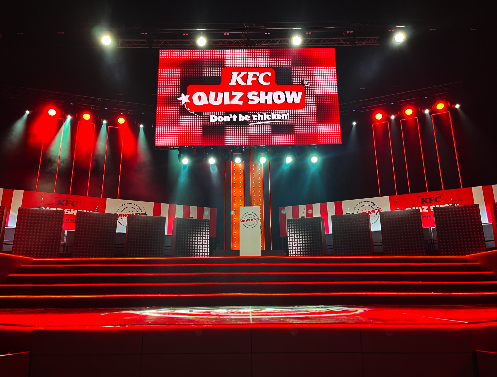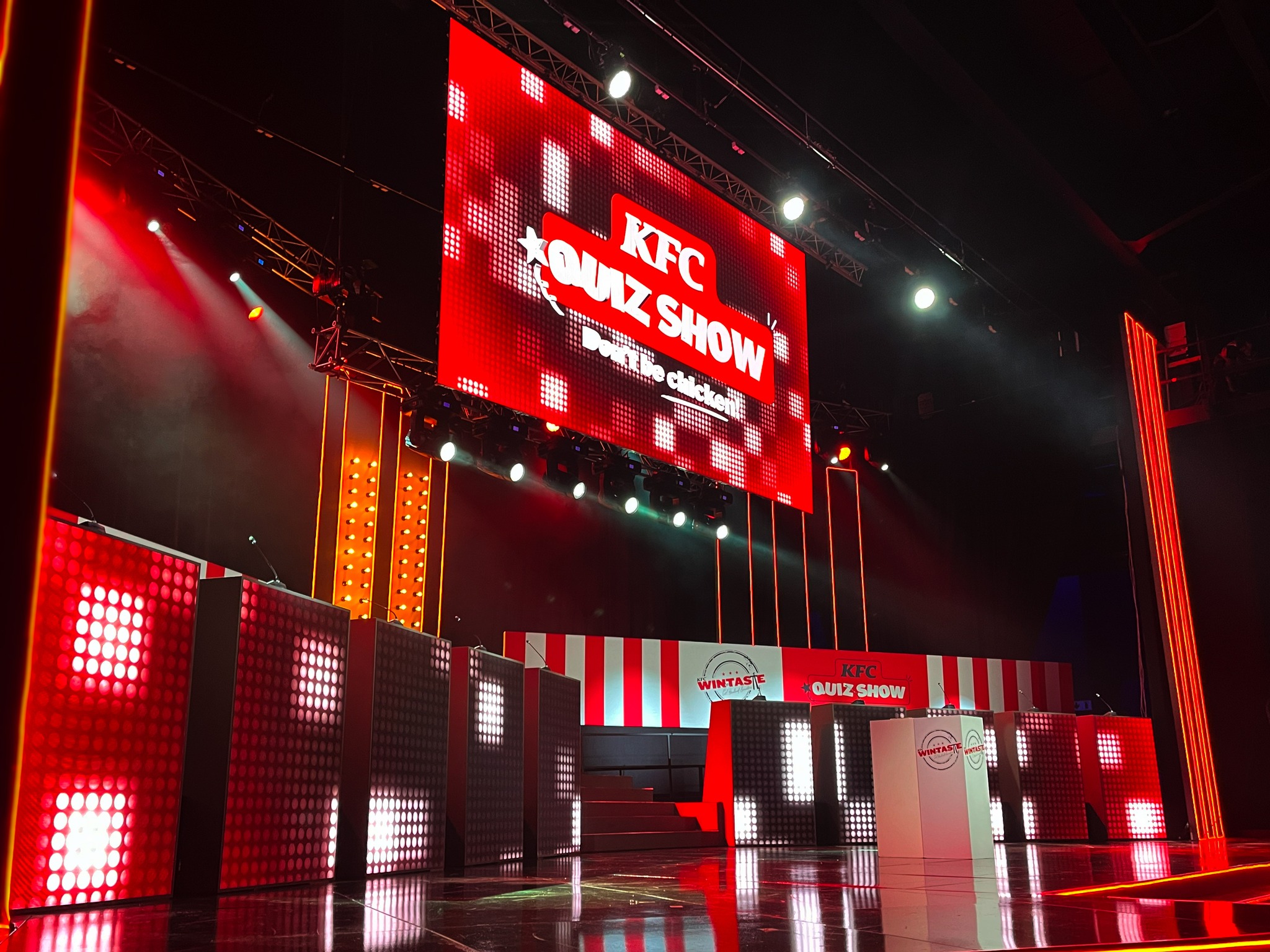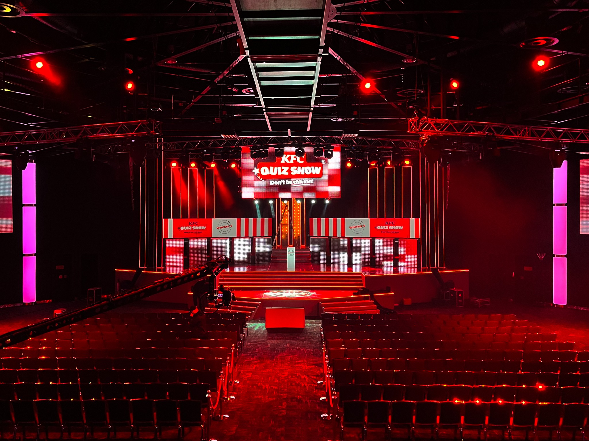 Dream Sets created a bold, broadcast-ready quiz show set, centered around a large LED screen and dynamic, tiered stage. The design features symmetrical contestant podiums with integrated lighting, all wrapped in a striking red-and-white aesthetic that enhances energy and visual impact on camera.