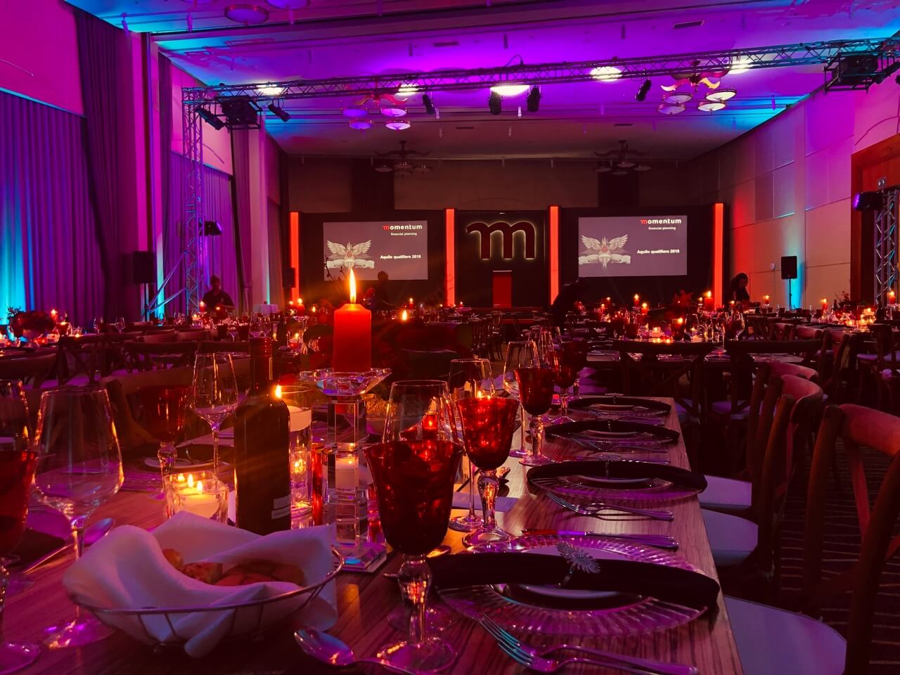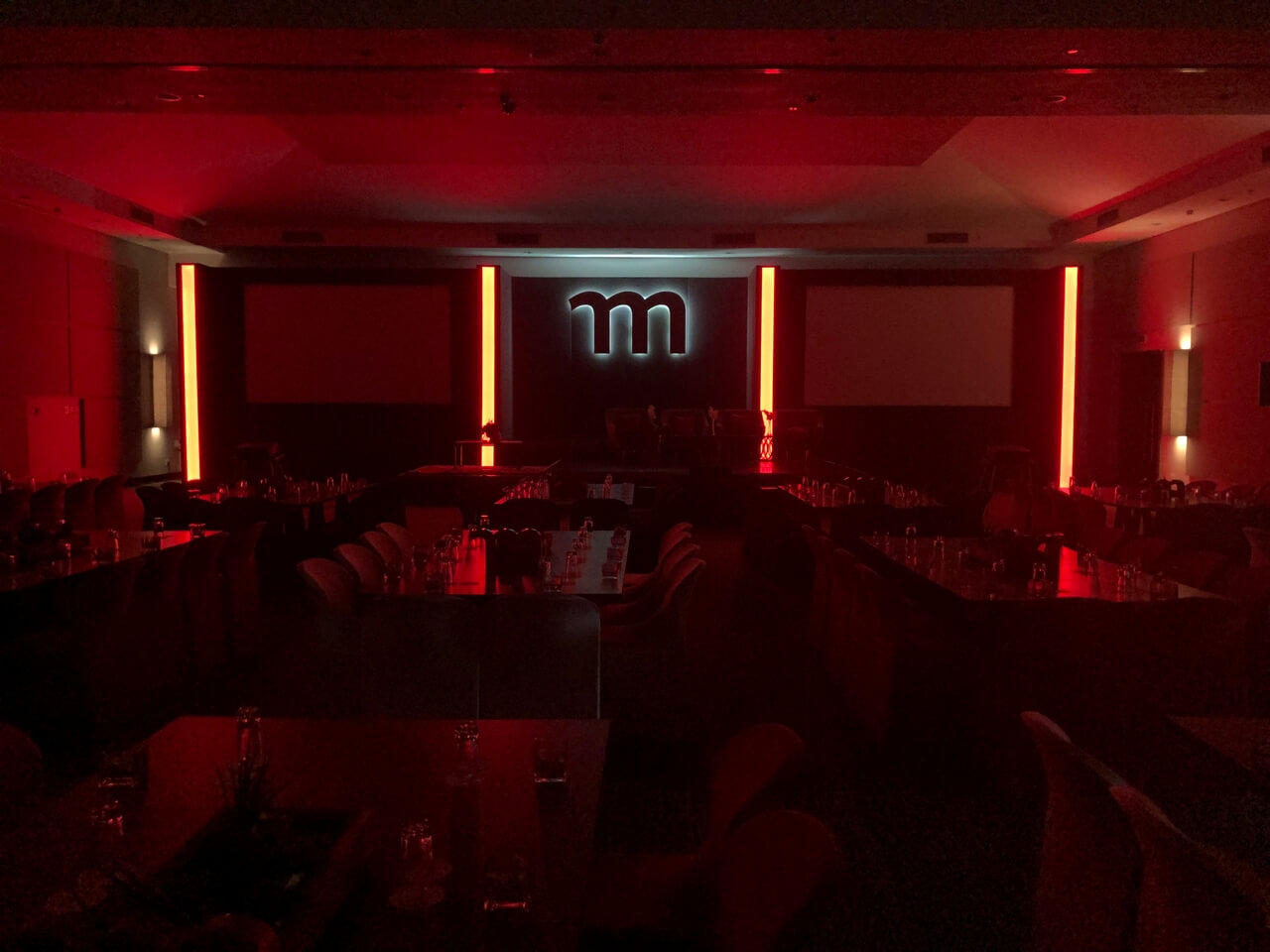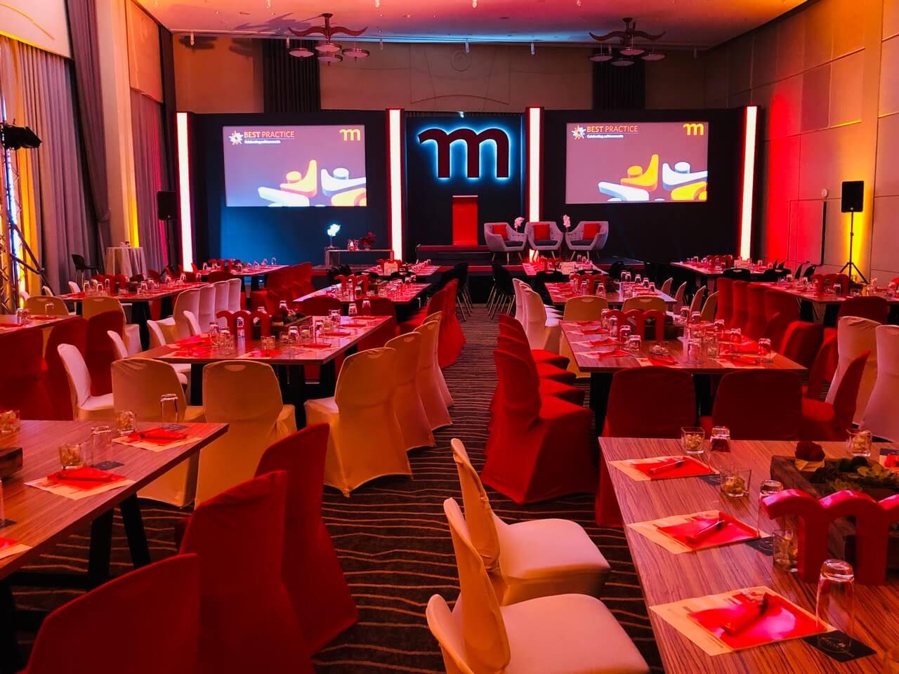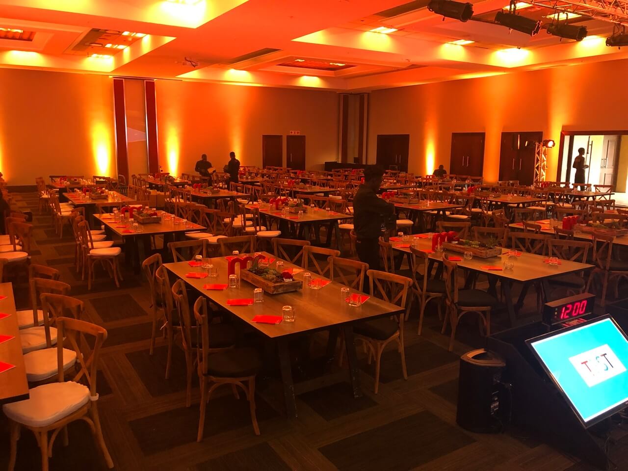 The lighting design played a key role in shaping the atmosphere, shifting seamlessly from warm, ambient tones during dining to bold, dynamic colour states for presentations and key moments. Integrated LED accents and stage lighting enhanced depth and focus, delivering a sophisticated, versatile environment that supported both the formal and inspirational aspects of the summit.