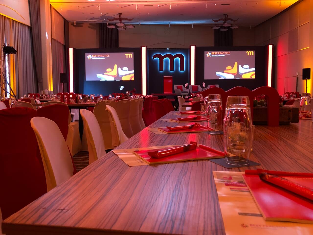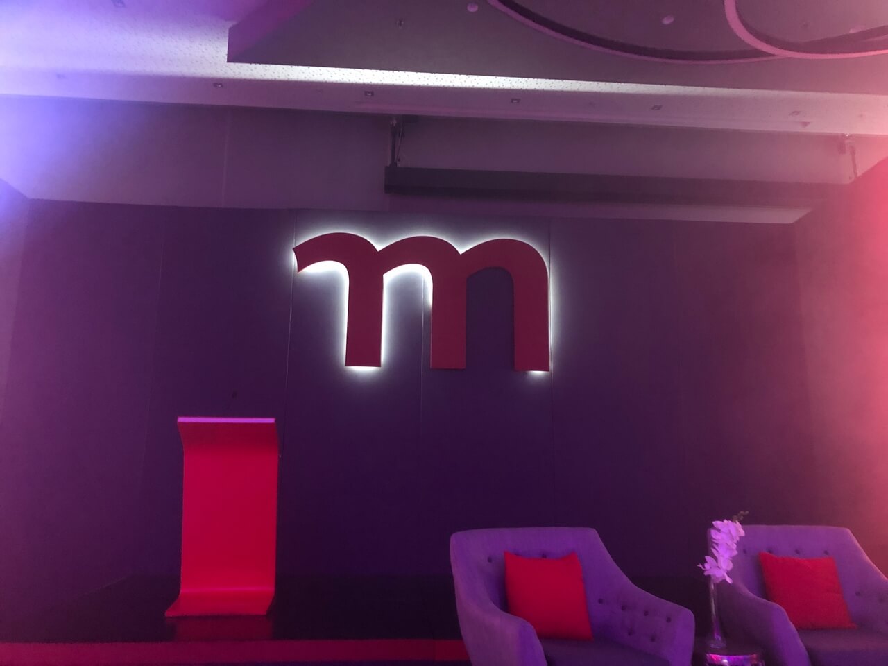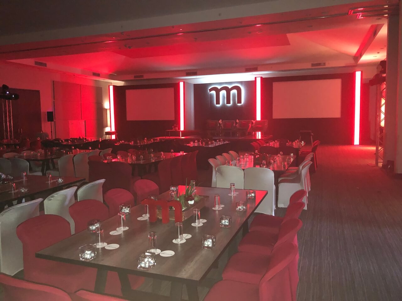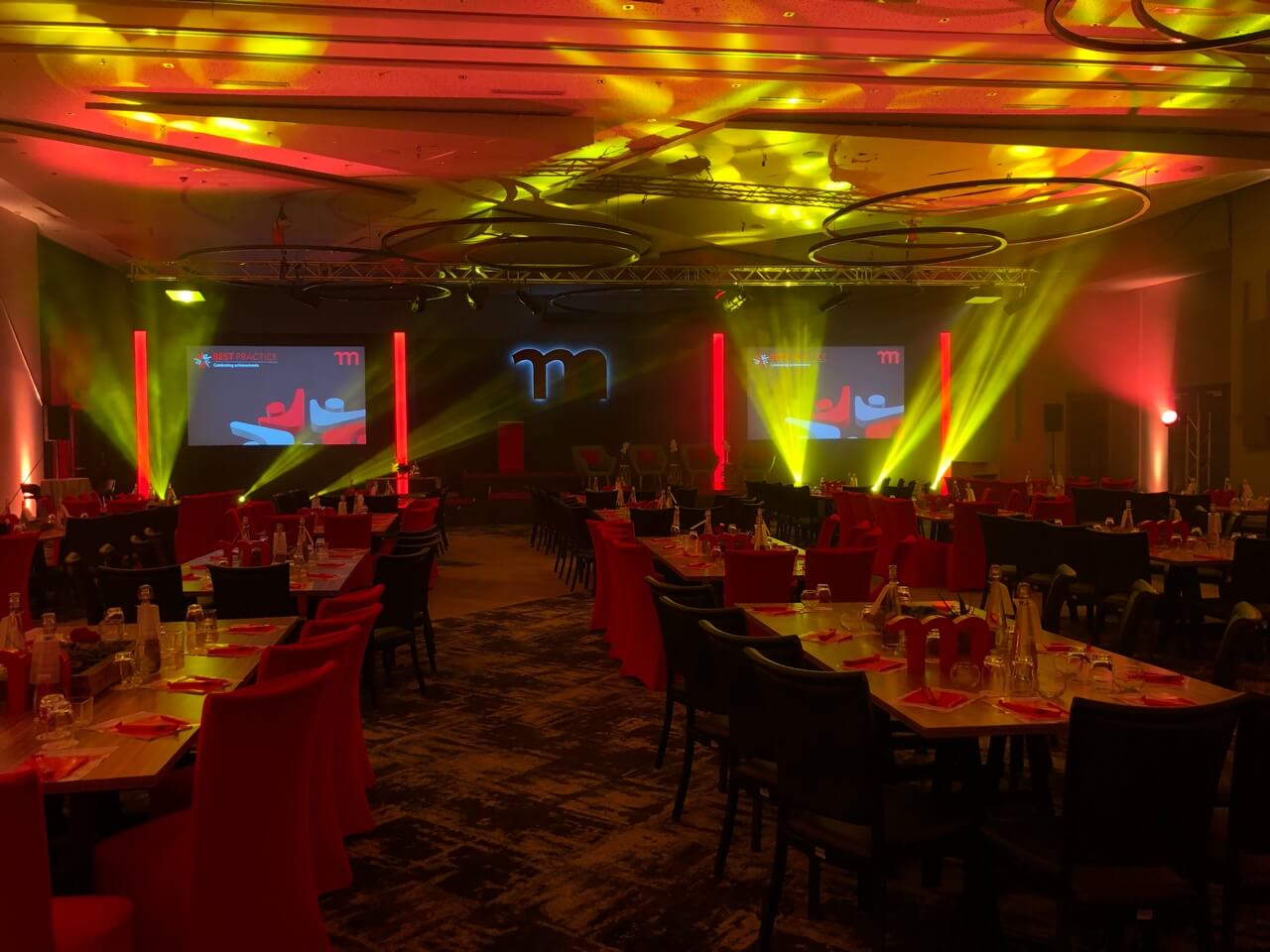 The lighting design played a key role in shaping the atmosphere, shifting seamlessly from warm, ambient tones during dining to bold, dynamic colour states for presentations and key moments. Integrated LED accents and stage lighting enhanced depth and focus, delivering a sophisticated, versatile environment that supported both the formal and inspirational aspects of the summit.