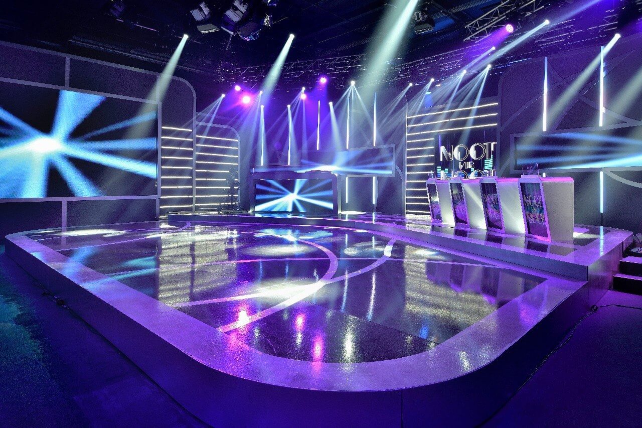 Dream Sets brought Noot vir Noot to life with a sleek, contemporary set that balances vibrant colour with clean, modern lines. The stage is framed by bold LED surfaces and curved scenic elements, creating a dynamic backdrop that enhances the musical energy of the show. A central performance area is complemented by illuminated contestant stations and layered staging, while the audience seating is carefully integrated to maintain an intimate yet high-production atmosphere.